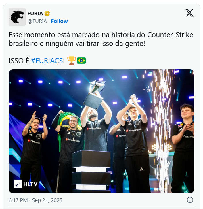 A vitória rendeu ao time o prêmio de US$ 200 mil (cerca de R$ 1,06 milhão) e quebrou um jejum de oito anos sem conquistas brasileiras em torneios de elite. A última vez havia sido com a SK Gaming, na ESL Pro League, ainda com Gabriel “FalleN”, hoje capitão da FURIA.